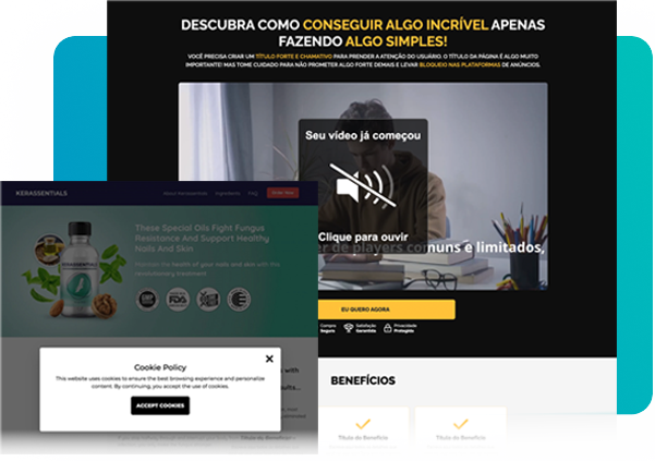 É só escolher, alterar e publicar! Crie em poucos cliques uma página de vendas, pressel, quizz, página de VSL (com e sem delay), termos ou políticas de privacidade com nossos templates prontos e validados, cuidadosamente criados usando como base o que já funciona no mercado.
